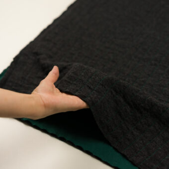 ・表面はウール&ナイロン(チャコール)、裏面はコットン(クロムグリーン)、2枚の天竺ニットがストライプ部分(約23mm送り)で接結されたW地