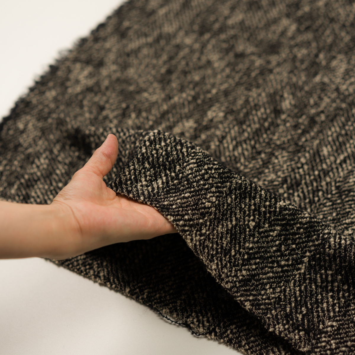・モコモコとしたループヤーン、ふっくらボリュームあるスラブヤーンなど、意匠糸を組み合わせて織られた、杉綾地のファンシーツイード