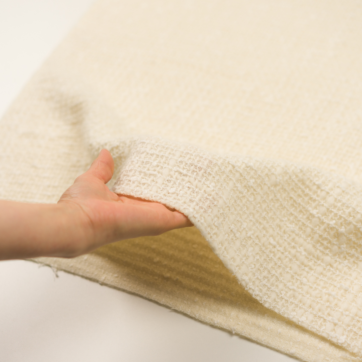 ・ふっくらボリュームあるスラブラーン、モコモコとした壁糸など、意匠糸を組み合わせて織られた、ファンシーツイード