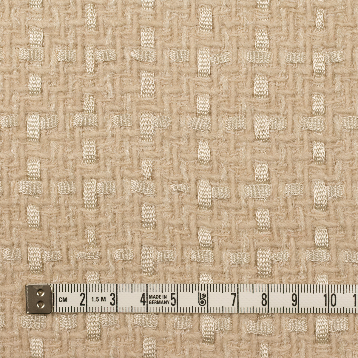 ・ふっくらとしたスラブヤーン、5mm幅のテープヤーン、透明感あるシュニールヤーンなど、意匠糸を組み合わせて織られた、ファンシーツイード