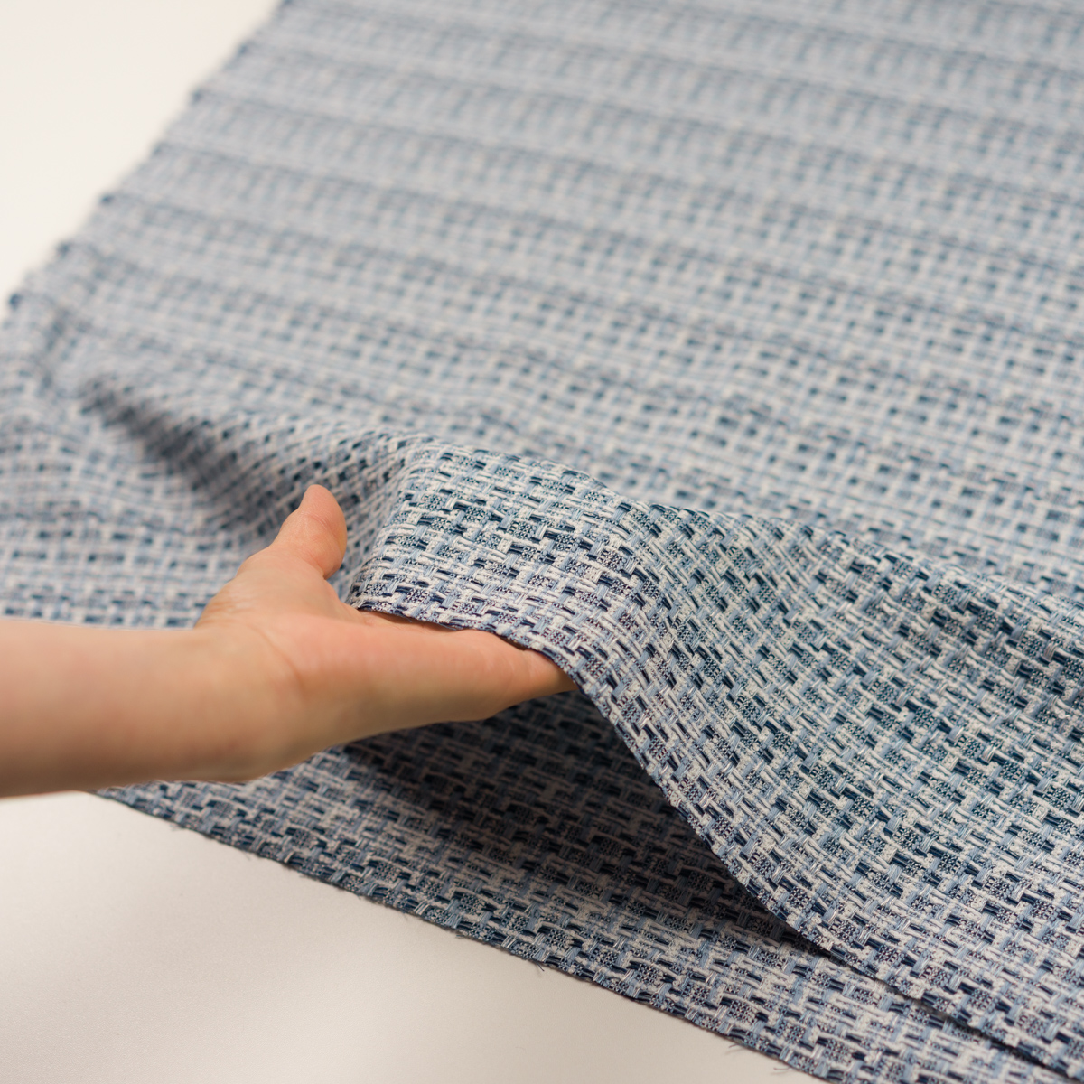 ・モコモコとしたループヤーン、2種類の糸を撚り合わせた杢糸など、意匠糸を組み合わせて織られた、ファンシーツイード