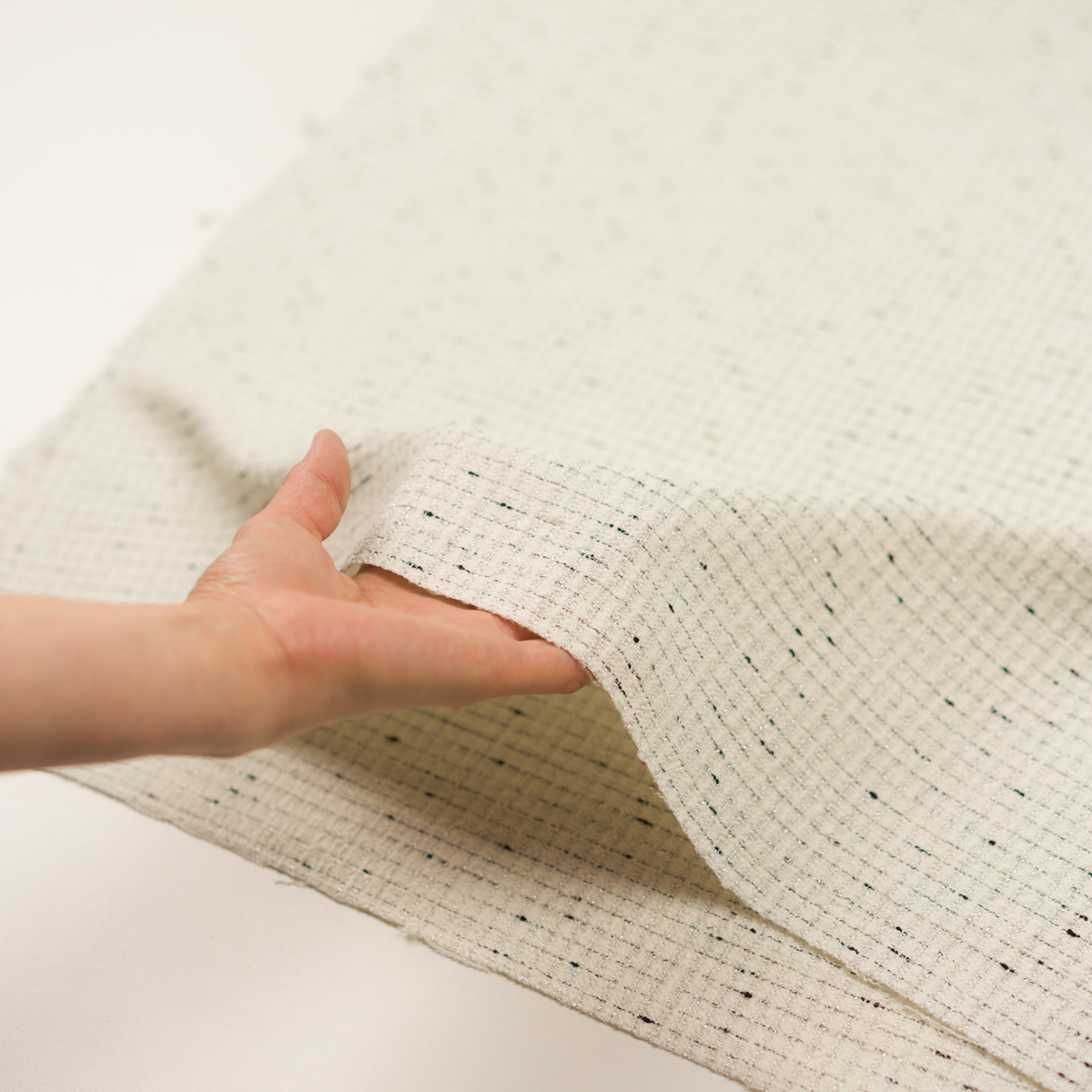 ・コブのあるノットヤーン、モコモコとした壁糸、キラリと光るメタルヤーンなど、意匠糸を組み合わせて織られた、ファンシーツイード