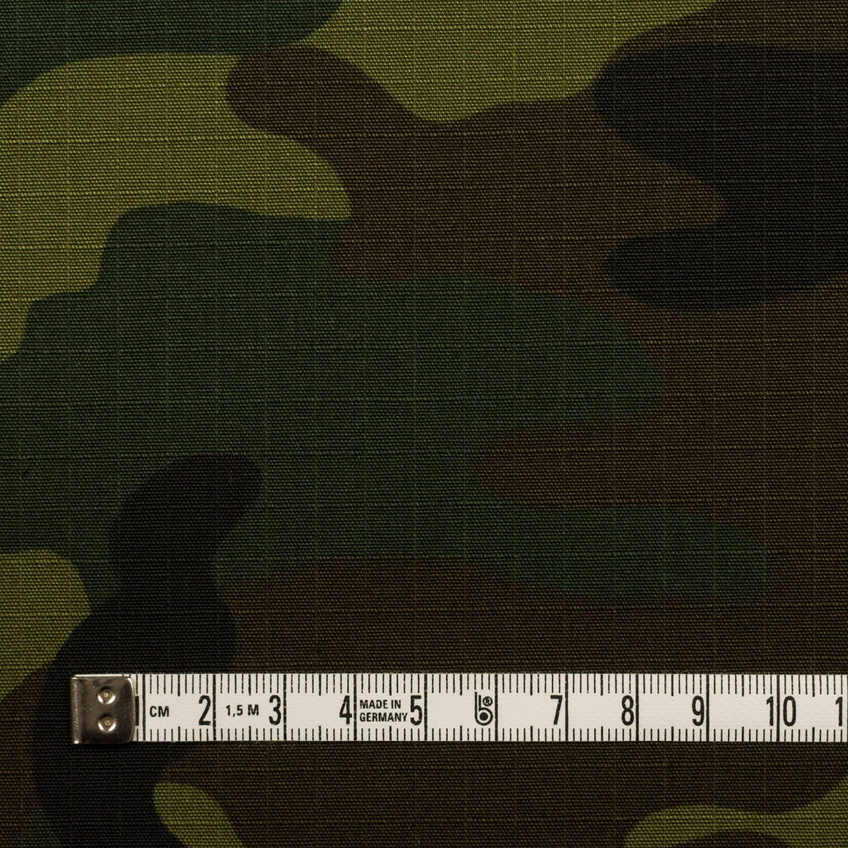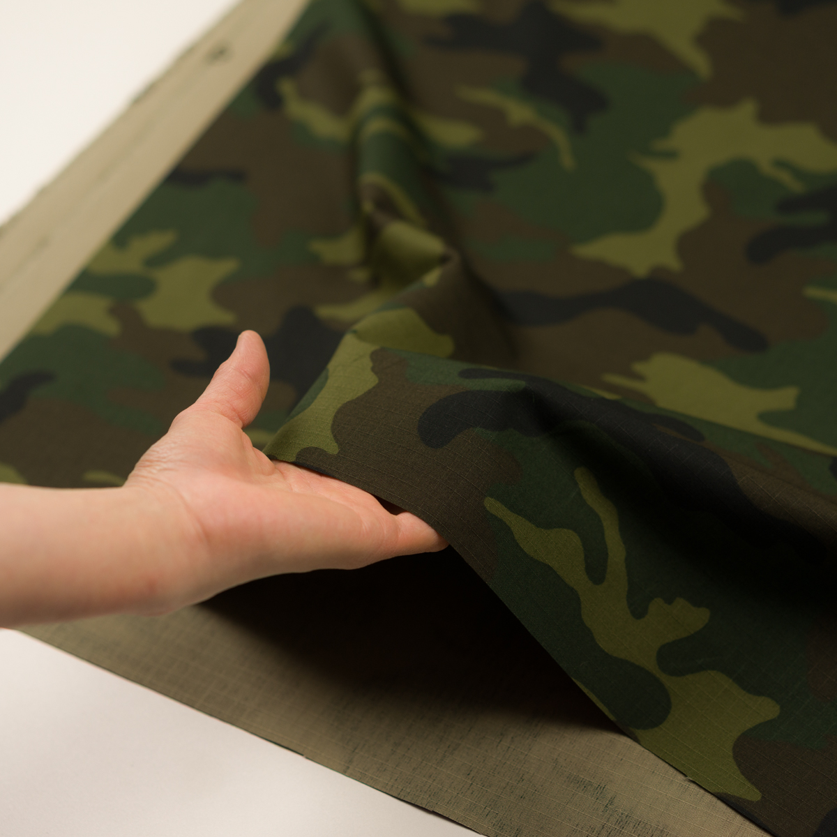 ・約8mm角の方眼状に太糸が織り込まれたリップストップ地に、迷彩プリント