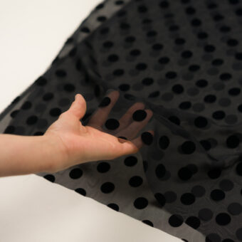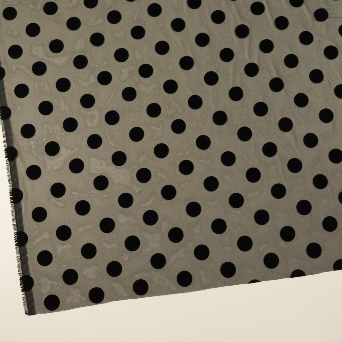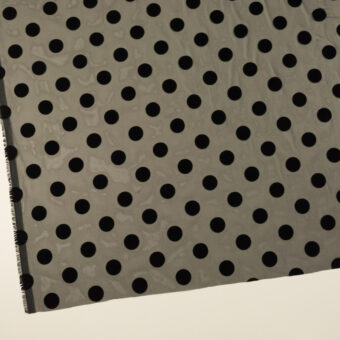 ・薄地で透けのあるシフォン地に、毛羽のある立体感なフロック加工(直径約20mmのドット)