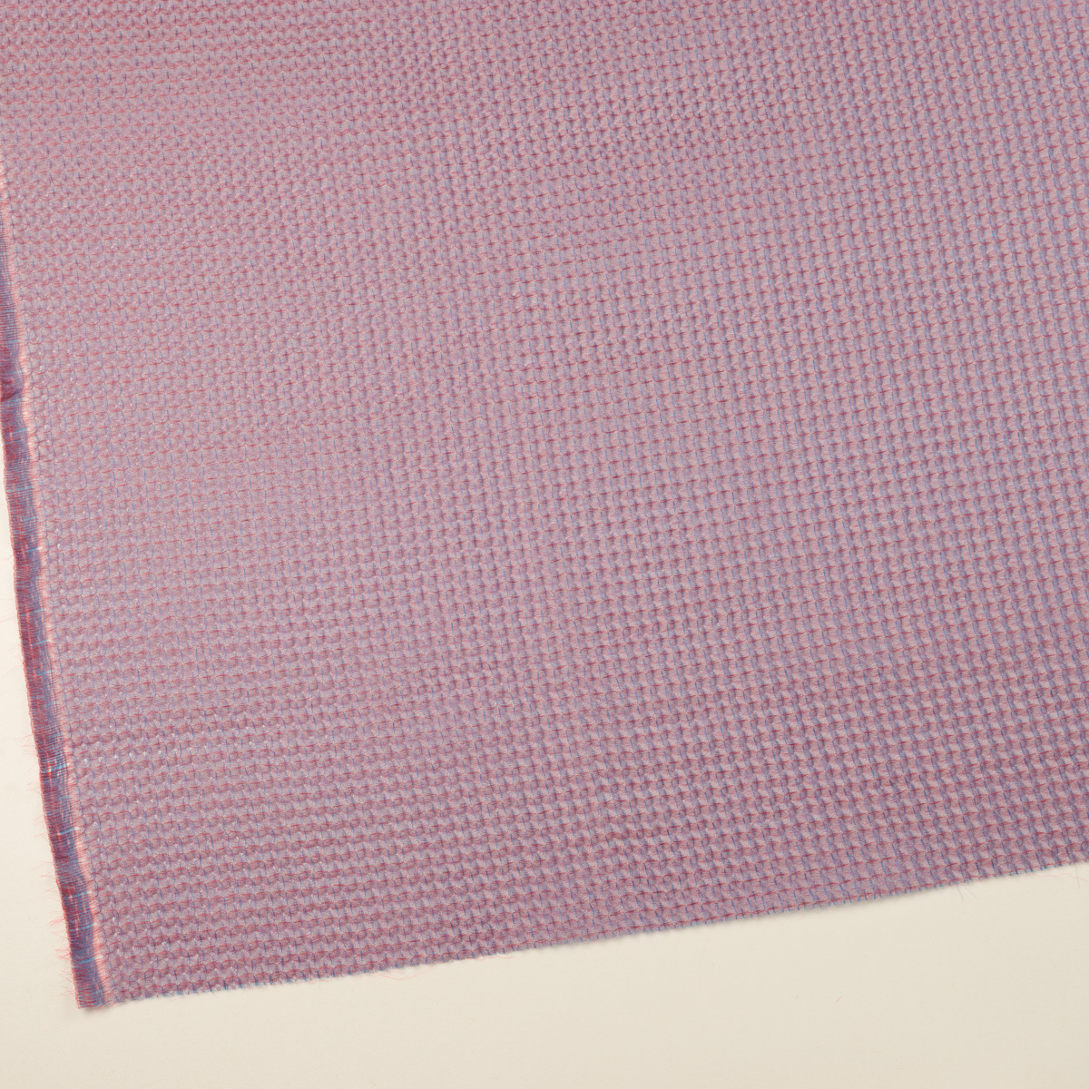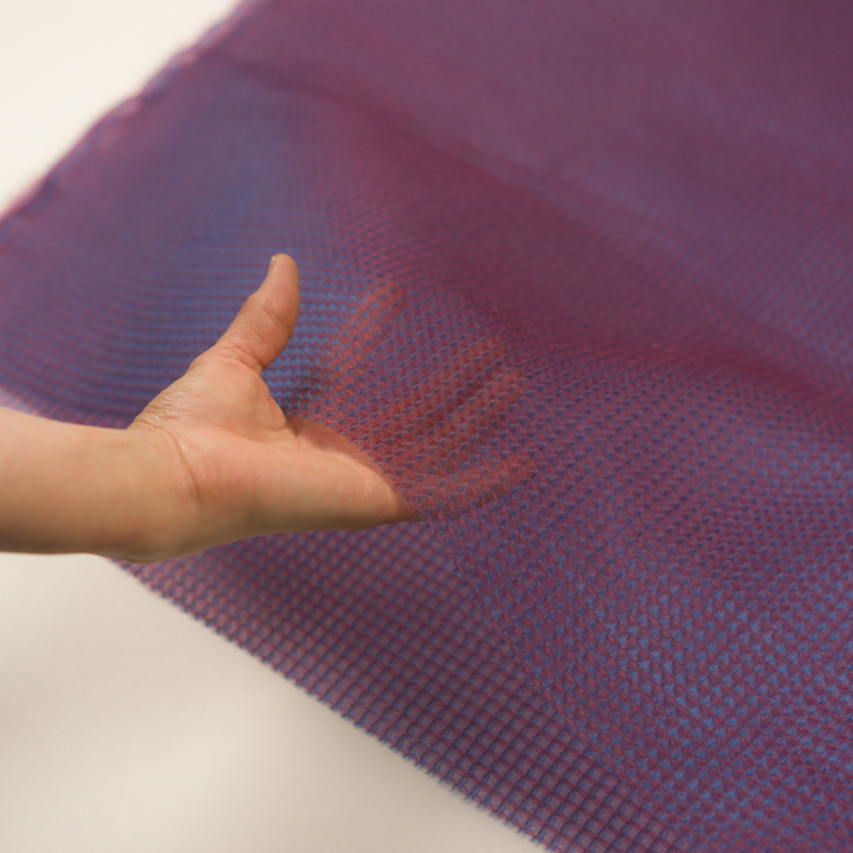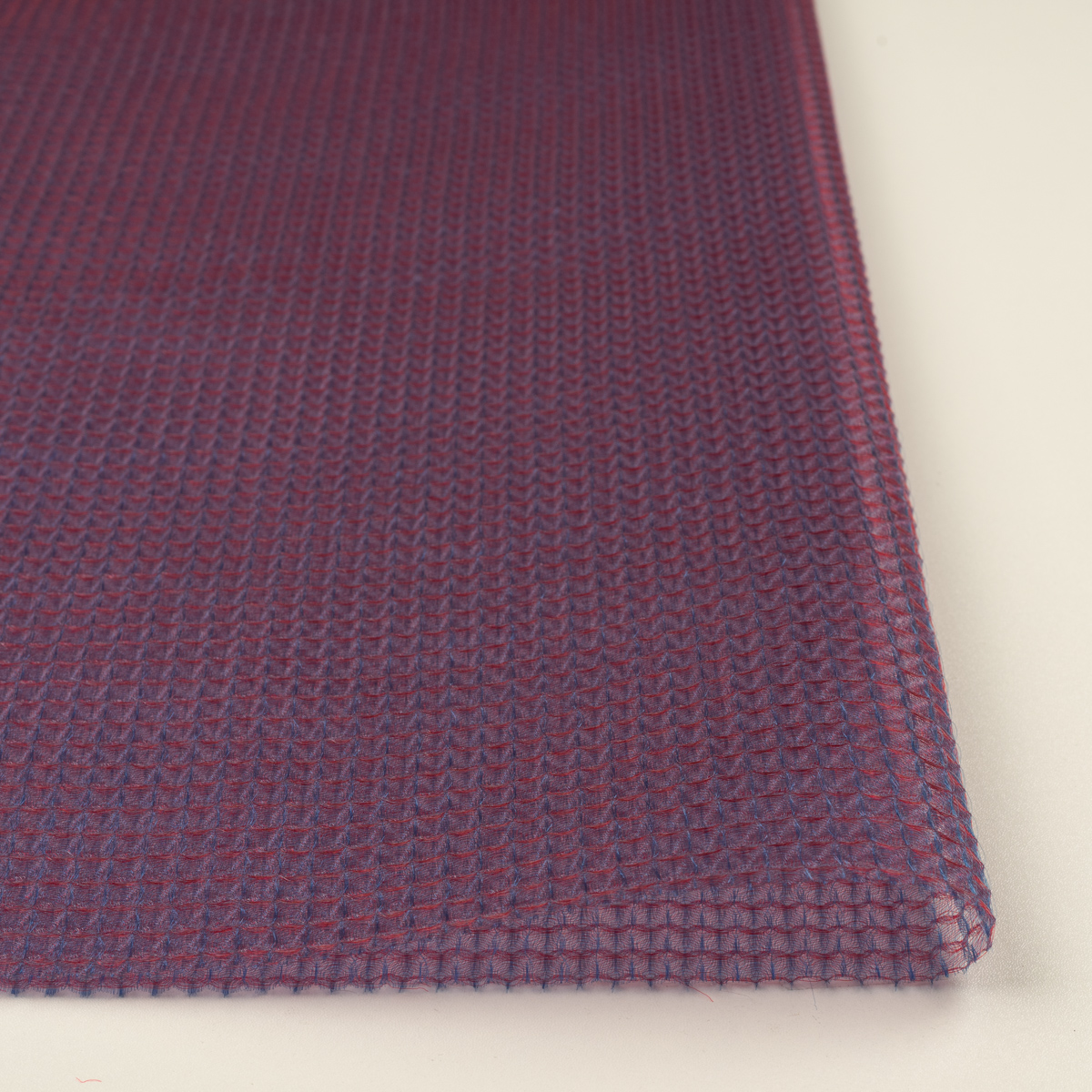 ・経糸緯糸が異なるカラー糸で織られたシャンブレーオーガンジー、凹凸ある表面のワッフル(蜂巣織り)